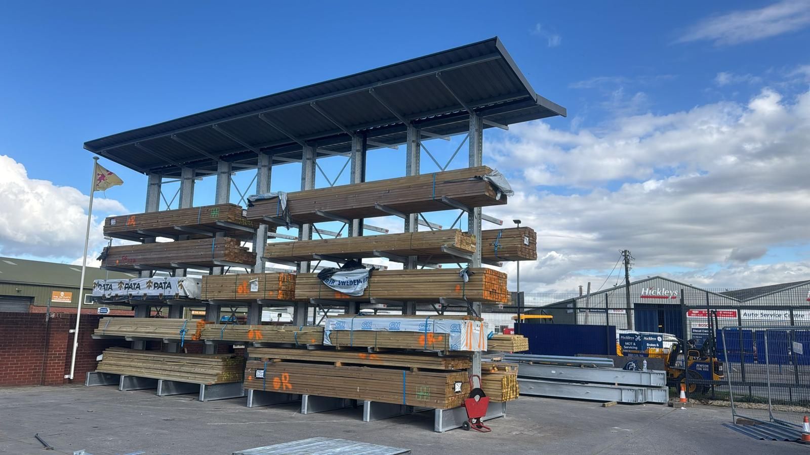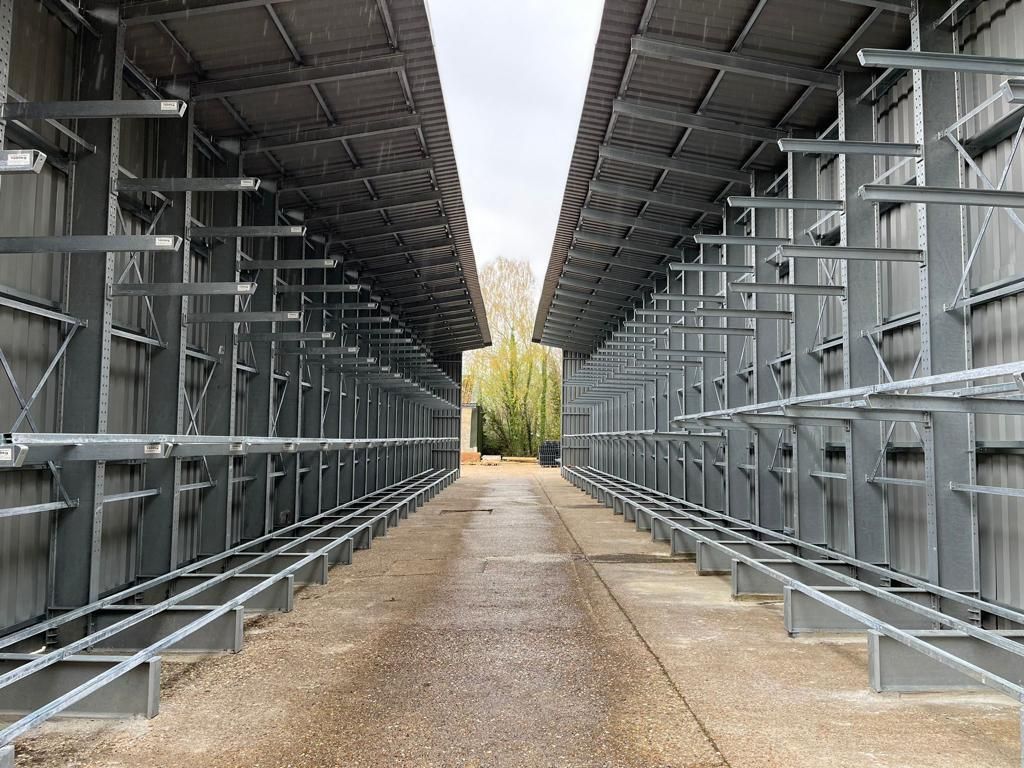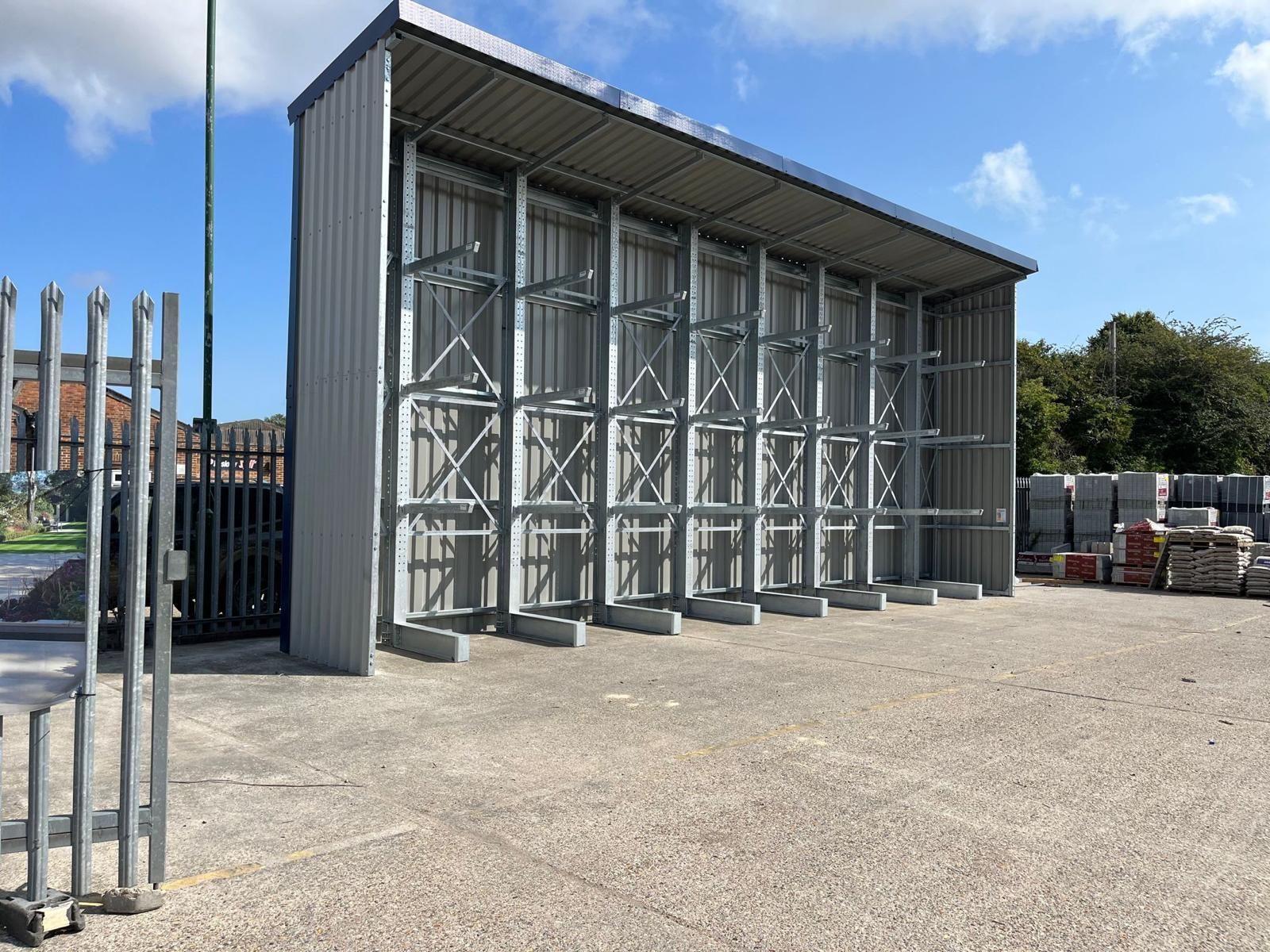 An external Cantilever sheet material rack, fully cladded with roof and available in various sizes.